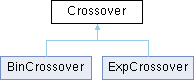 Crossover defines the interface for all DE crossover operators. Each concrete crossover strategy (BinCrossover, ExpCrossover) implements the crossover() method to recombine a target vector and mutant vector, creating a trial vector for evaluation.